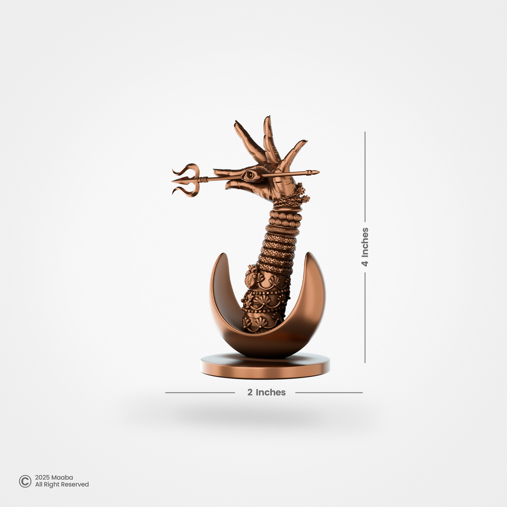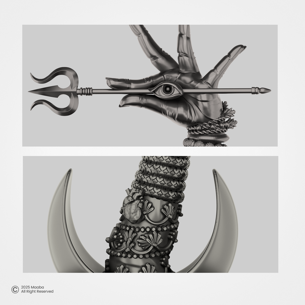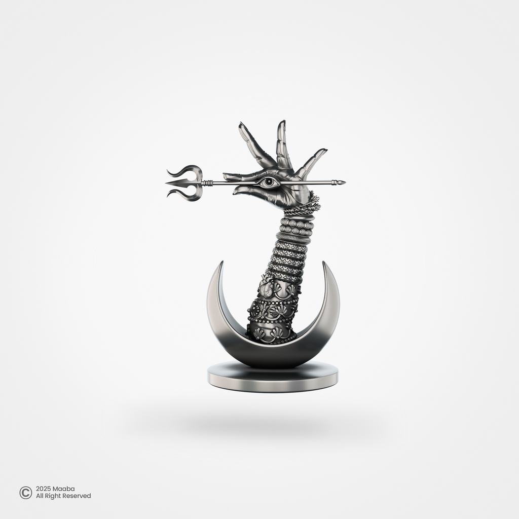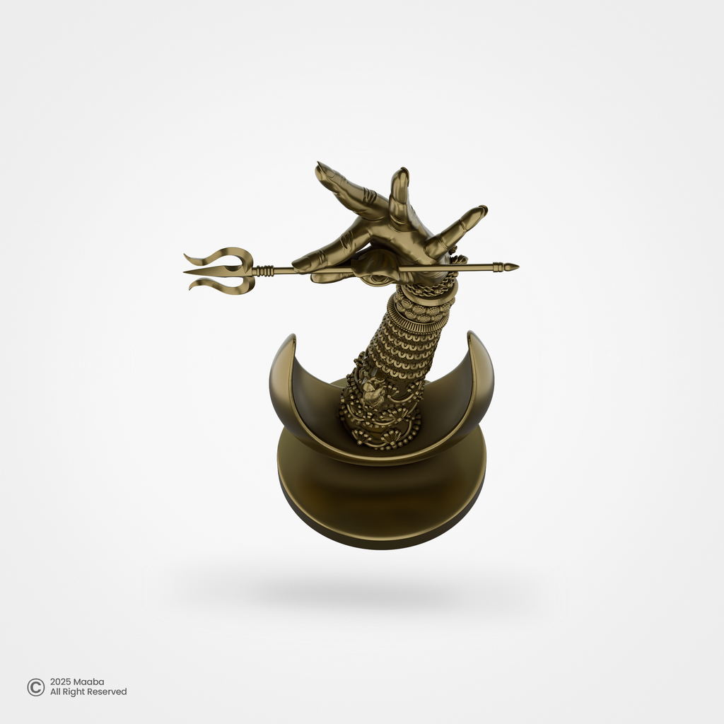 The hand forms Jñāna Mudrā, where the thumb represents Brahman, the cosmic consciousness, and the index finger symbolizes the individual self. Their union signifies the melting of individuality into the universal consciousness. The remaining three fingers embody sattva, rajas, and tamas, the fundamental guṇas of existence. Through this mudrā, one enters the highest awareness - becoming one with the Universal Being. The Triśūla bearing the divine eye represents the destruction of every layer of inauspiciousness hidden within one’s consciousness, clearing the path for truth, purity, and expansion.